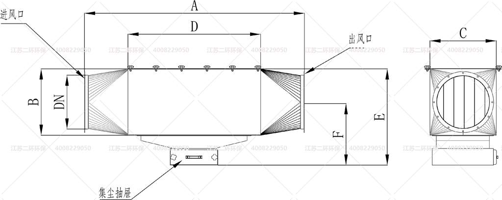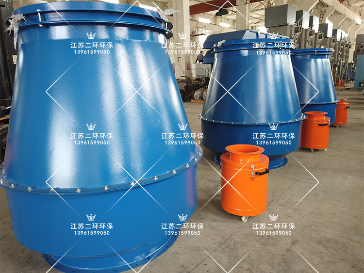 4、旋流型管道火花捕捉器,内部安装了旋流板,使进入的火花急速产生气流涡旋,多次撞击而熄灭,掉入底部灰仓。