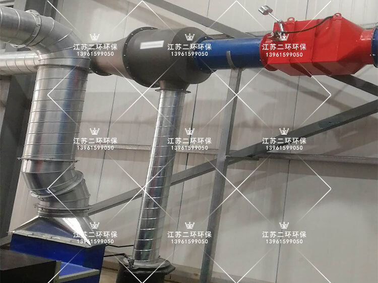2、电焊、金属切割打磨的火花烟尘,在引风机抽风的动力作用下,进入抽风管道。