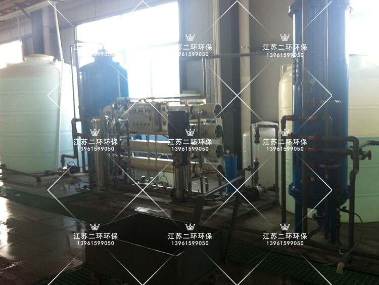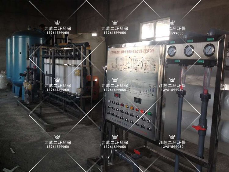自来水→原水箱→原水泵→机械过滤器(絮凝剂加药)→活性炭过滤器(阻垢剂加药)→保安微滤器→高压泵→反渗透装置→ 淡水箱→淡水泵→混合柱(1用1备)→酸碱再生装置→纯水箱→纯水泵→用水点